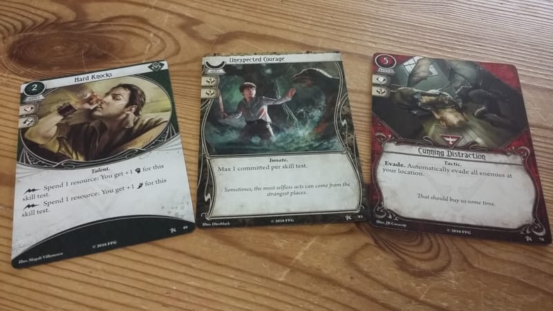It is possible for players to commit cards to their own skill check or that of another player. Cards committed must have matching icon(s) on the top left hand side of the card as the skill check being performed. Each matching icon increases the investigators skill level by 1 for that test.