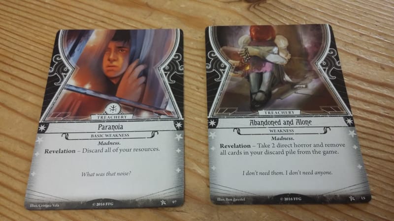 Each player will also have two weakness cards in their deck, one specific for their investigator and one basic weakness chosen at random. These can affect the player at anytime when they are drawn into your hand during the game.