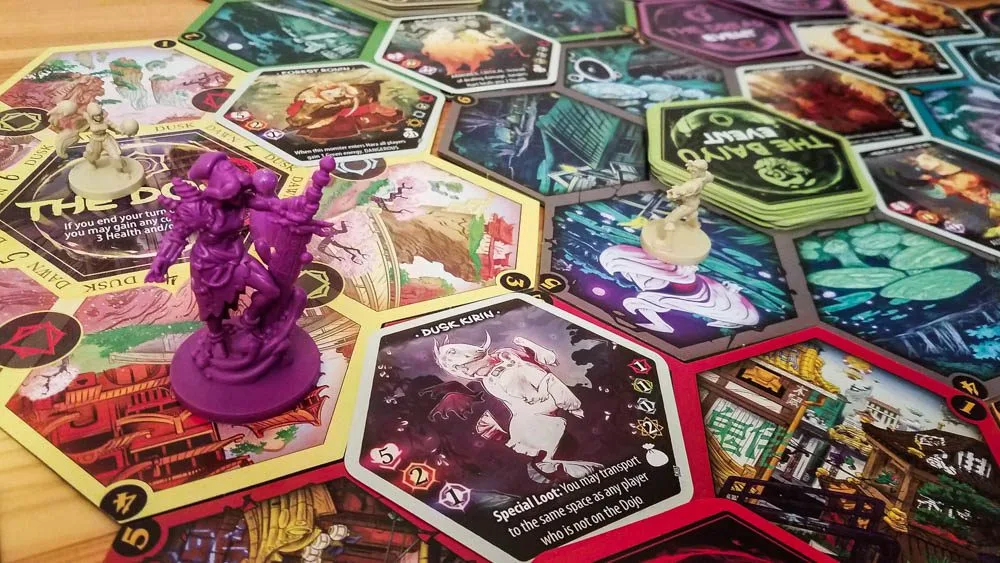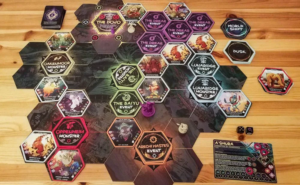 Most of the rules for Champions of Hara are the same regardless of game mode. You’ll play through a maximum of six days, and each day has a Dawn round and a Dusk round. During Dawn more monsters and events will show up on the six World tiles, and during Dusk rifts will open up and monsters will show up in random areas. You’ll also draw World Shift cards between days, which physically change the map.