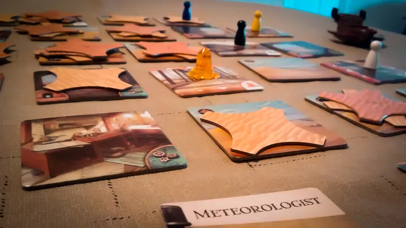 A player can take up to four actions per turn and they need to draw a storm card equal to the current sandstorm level. Players’ actions are: move, remove sand, excavate or pick up a part.
