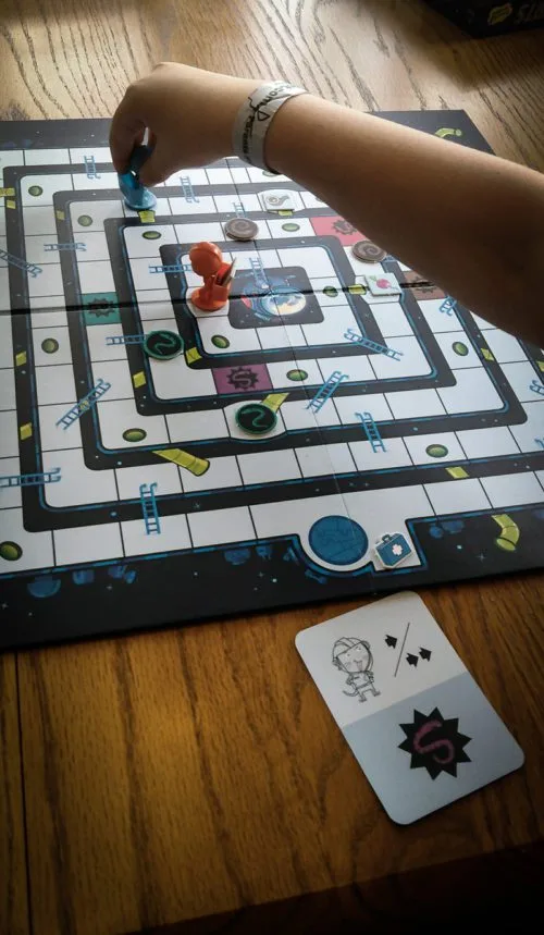 To win the game, you have to work together to pick up the four pieces of equipment in the space station and everyone has to make it to the escape pod. If anyone gets bitten twice by the snakes, everyone loses. If anyone falls through the air shaft and out of the space station, everyone loses. If a snake makes it to the escape pod, guess what, everyone loses. Finally, if the deck of cards runs out and the current player has no card to play, thennnnn… you lose.