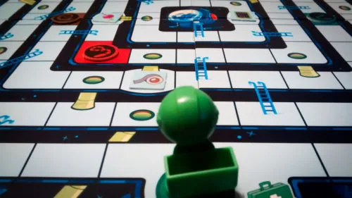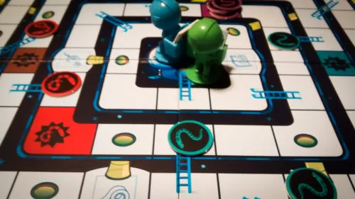 Setting up the Space Escape board is extremely simple – put the board in the middle of the table, then place the four snakes and four equipment pieces on their matching spaces. Everyone will get a mole rat of their own, a med kit, and their first card. Then you’re ready to go!