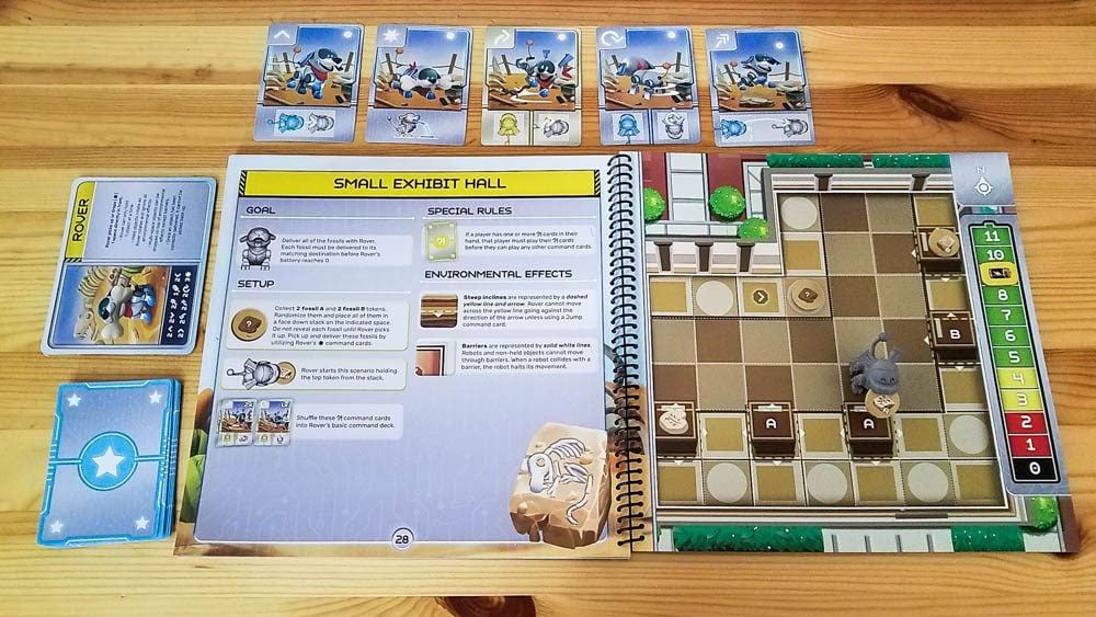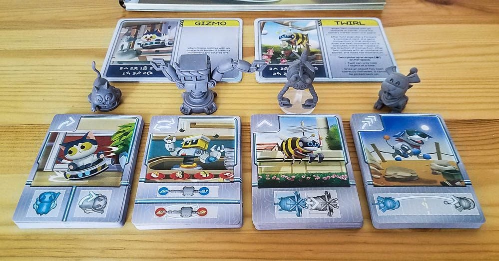 There are four different robots in the game, each coming with their own sets of cards and scenarios. Gizmo the kitty-bot needs to clean up dust bunnies around the house, but tables, chairs, cats, and other things can make it tough to navigate the rooms. Lefty’s job is to grab food off of a conveyor belt and feed the cats. Twirl has to keep the garden in great shape by planting seeds and feeding the koi fish and mice. Rover the doggy-bot has to help open a new museum by digging up and delivering dinosaur fossils. There are also some special/advanced scenarios that change up the robots’ goals.