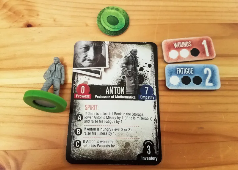The number of actions each character has depends on their current conditions, which include their fatigue, illness, and misery levels. Some of the characters also have special abilities that they can use during specific phases of the game.