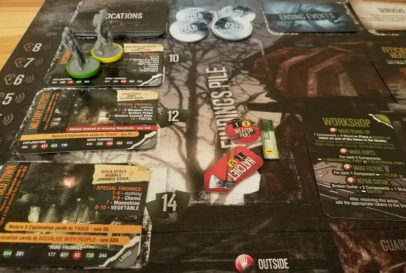 The Scavenging phase is the other main phase of the round. You’ll choose which of the three locations currently on the board you want to visit and what items you want to take with you to trade with and/or to defend yourselves with. While you’re at the location, you’ll be going through a deck of Exploration cards to find out what happens while you’re there. Some of these cards will simply allow you to grab new items, while others might have you raise the noise level or even “roll for noise,” which is when you roll a die to see if anyone in that location heard you. This is the main “push your luck” part of the game because you often have to decide if you want to take a chance and keep exploring or go back home since the noise level has gotten a bit too high. After you’re done exploring, you’ll grab everything that you can (based on your characters’ total “inventory” level) and head back home.
