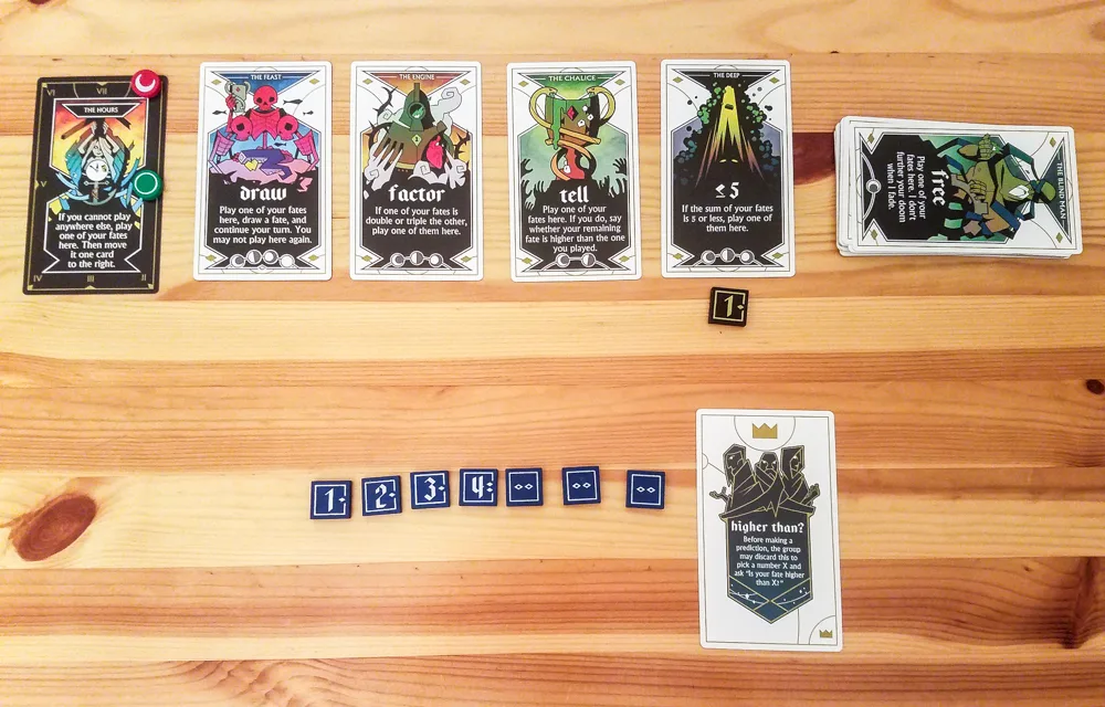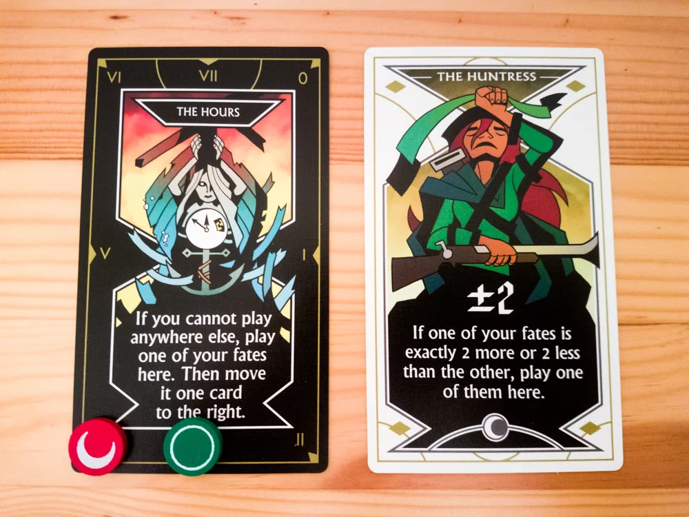 Sometimes none of the Arcana cards on the table can legally be used. In those cases, you place the Fate token on The Hours card. This actually does give your teammates information, though, since they’ll know you couldn’t place the Fate token on any of the other cards. After your teammates have seen you’ve placed the Fate token on The Hours card, you’ll then move it to the Arcana card directly next to The Hours card.