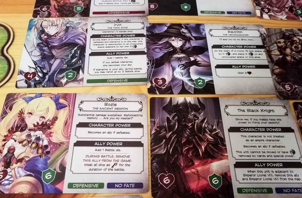 Fate cards are another important part of Unicornus Knights. These cards come into play whenever a character moves into an area with an opposing character or when two opposing characters end up adjacent to each other. When either of those things happen, a fate card is drawn and those two characters are now considered “bound by fate.” Some of the fate cards have instant effects, some will have ongoing effects, and others will tell you what you need to do once the Empire character has been defeated. Often this leads to an Empire character joining up with a Kingdom character as an ally, giving them new special abilities.