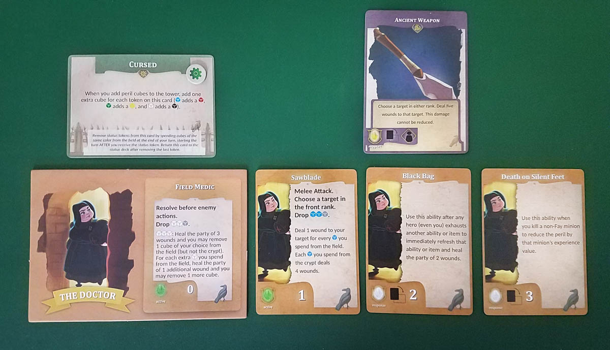 There are four tracks on the main board: Luck, Experience, Party Wounds, and Peril. Luck is gained in multiple ways and it can be spent to get cubes of any color. When your party gains enough experience by defeating enemies, everyone levels up and gets a new skill card (each hero has multiple Level 1, 2, and 3 skill cards). The Party Wounds track is where you track your team’s health. You’ll gain Peril whenever an enemy attacks you and you’ll trigger Peril Events when you reach the thresholds shown on the room cards.