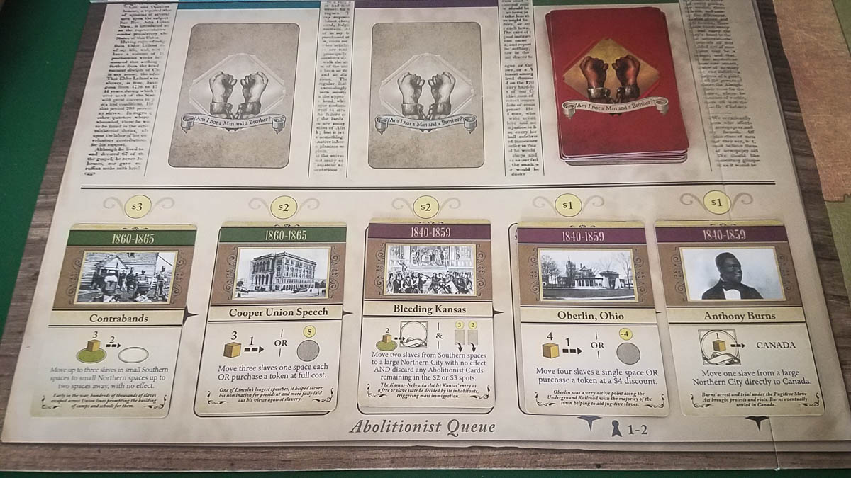 • The theme in Freedom: The Underground Railroad might not work for some people. This game covers a very dark part of human history, which does take some time to adjust to. There were two people in my group who liked the game for the most part, but they hated the fact that they had to “sacrifice” some slaves to save the others (though it does make sense thematically).