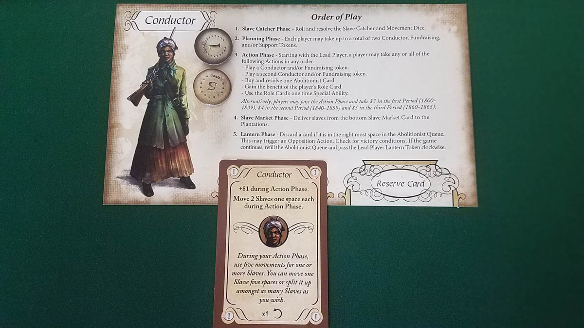 During the main Actions phase, you’ll be fundraising and using your money to gain support tokens and conductor tokens. Those tokens, along with your unique abilities, will allow you to move slaves along different tracks around the United States. You can also buy one Abolitionist card every round, which can help you accomplish your goals faster. There are some Opposition cards in the Abolitionist decks that can make the rounds tougher in different ways.