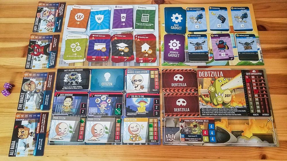 - My biggest issue with Debtzilla is that you just don’t have that many tough decisions to make. You’ll choose your gadgets based on your hero’s abilities or the other gadgets you’ve already bought, and you’ll choose the villain you’re going to face based on the gadgets you have or you’ll just go after the biggest threat on the board. Then it’s all about the dice results. It’s pretty rare that you’ll look back and think you should have done things differently.