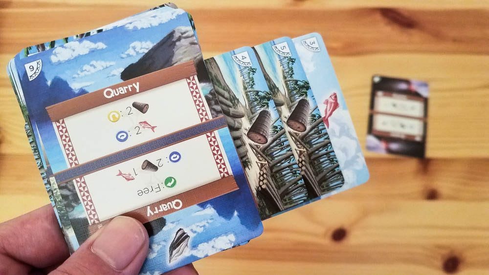 Each card in Palm Island has four states: the top and bottom of the front of the card, and the top and bottom of the back of the card. You’ll be attempting to upgrade your cards to higher levels throughout the game so you can maximize your points. For example, you’ll need one fish and one log to upgrade your Housing the first time.