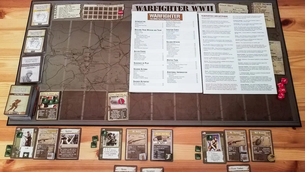 Warfighter: The WWII Tactical Combat Card Game is a solo or cooperative war game in which you have a set amount of time to complete combat missions. In the core game you play as the Americans against the Germans, but the expansion packs allow you to play as different countries.
