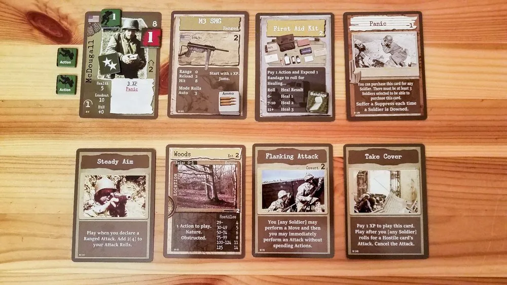 During the Soldier Turn, your squad will be attempting to fight off the enemies and move toward the objective location. There’s no turn order for your soldiers; you take actions and play action cards with your soldiers in any order until everyone is out of actions.