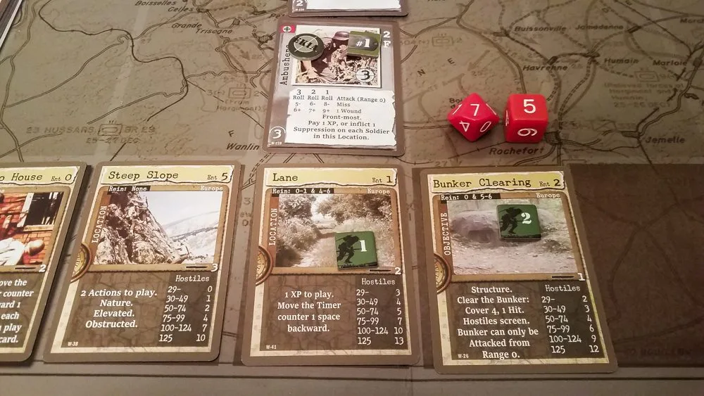 Each Player Soldier also has action cards that they can use. These cards can do a number of things for the soldiers, including making attacks more powerful and helping them target screened enemy soldiers. The action card deck also includes the location cards that you’ll need to move closer to your objective. When moving to new locations, you’ll often have to discard some action cards to “pay” their entrance costs.