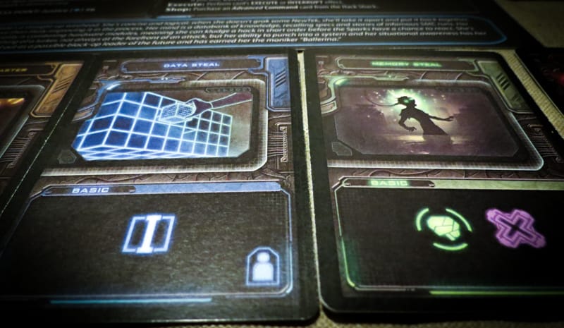 You’ll start each round with five cards in your hand, but you can upgrade those cards by buying “advanced command” cards from the Hack Shack. There will always be four cards available to you at the Hack Shack at the start of your turn. All you have to do to buy one is pay the cost on the card, trash one of the cards you used to buy it, and then add that new advanced command card to your hand. The advanced command cards not only have the basic commands, they also have “execute” or “interrupt” functions that give you additional abilities.