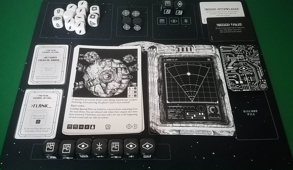 Each chapter card will have some story text and will tell you what you can do to advance. In many cases you’re going to go into combat with the enemies, but you might also be able to perform some type of skill check to quickly move on to the next chapter. Every time you’re about to reveal a new chapter card, you have to pick a crewmember to be the leader in case the card has a “You” effect, which would only affect that crewmember.
