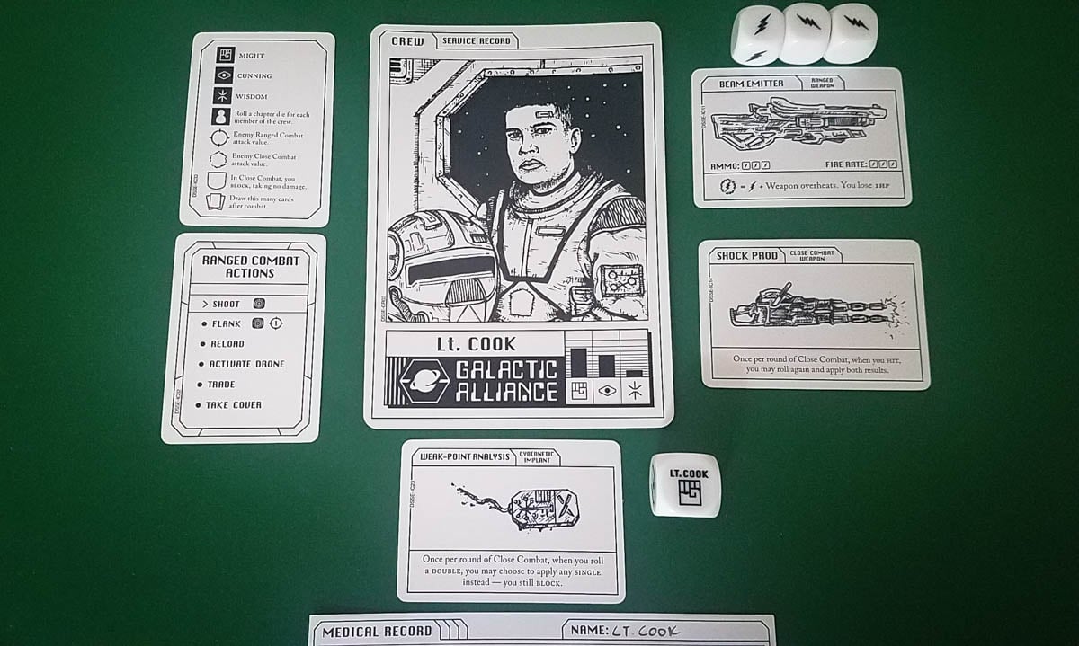 Combat is usually multiple rounds of you hitting the enemy and the enemy hitting you back. You have to remove all of the enemy’s health dice to move on to the next chapter card. During each combat round, your group can choose to go into ranged combat or close combat. Once you go into close combat, though, you can no longer go into ranged combat against that enemy. Instead of fighting during a combat round, you can choose to heal, reload a weapon, take an item from another crewmember, or do nothing (“take cover”).