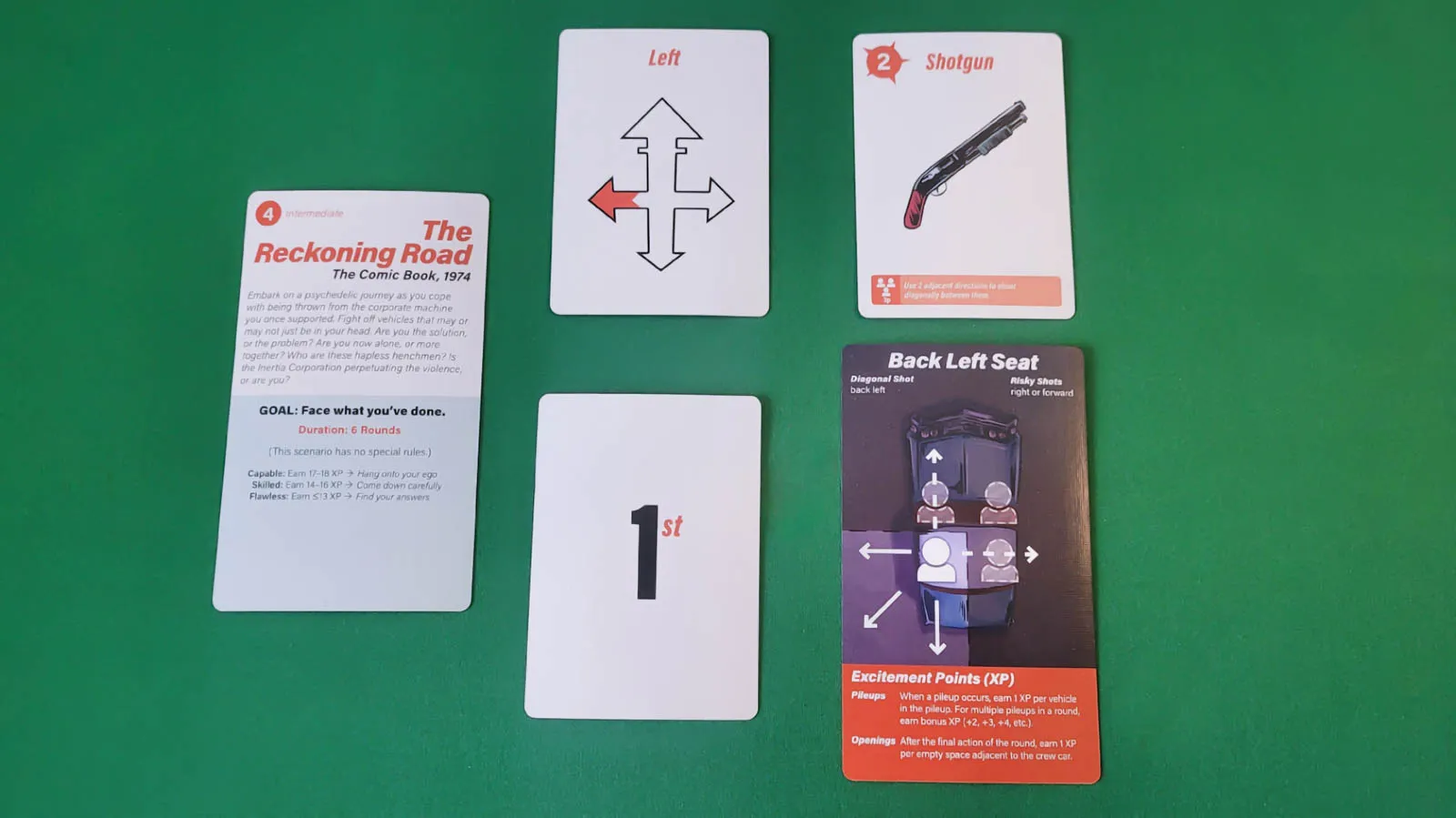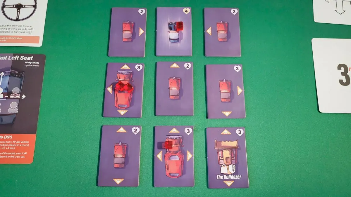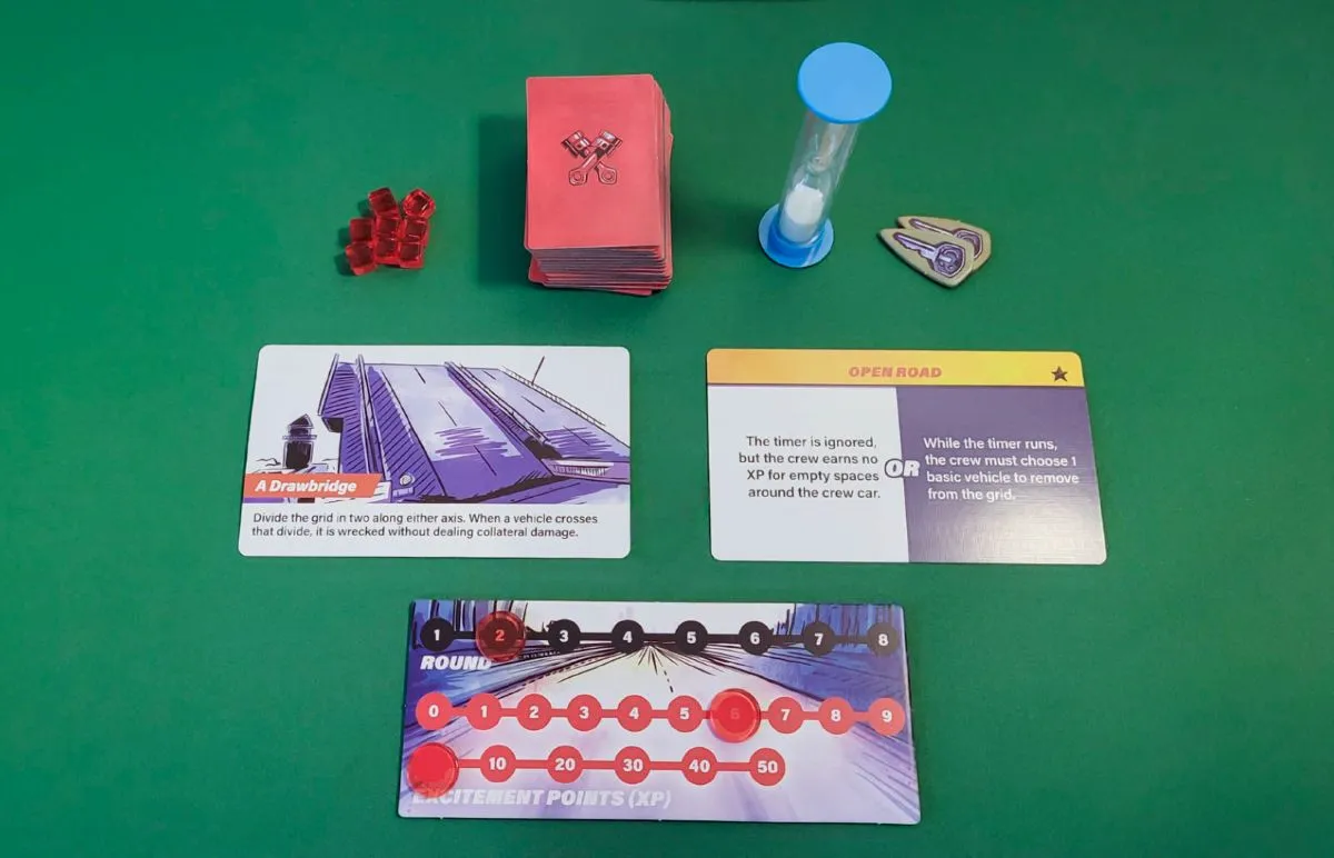 You’ll earn Excitement Points (XP) when you trigger pileups, which happen when multiple vehicles are wrecked in a single turn. At the end of each round, you’ll gain additional XP for any open spaces around your car. Depending on the scenario, XP might be part of your victory conditions or can be spent on in-game bonuses to help your crew.