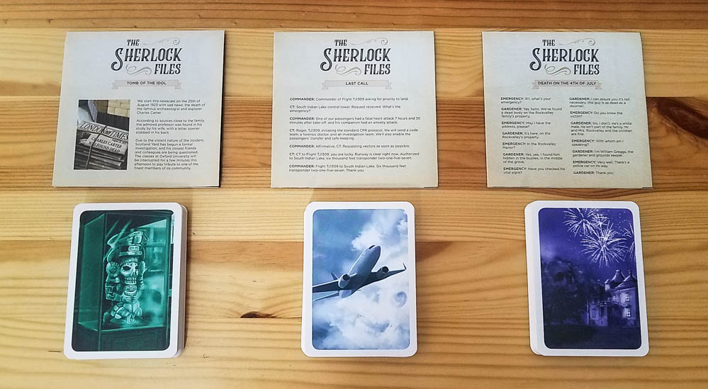 Each case in The Sherlock Files starts with a short case introduction that you’ll read aloud. You then put the first clue card on the table, shuffle the other cards, and deal each player three cards (two cards if playing with 6+ players).