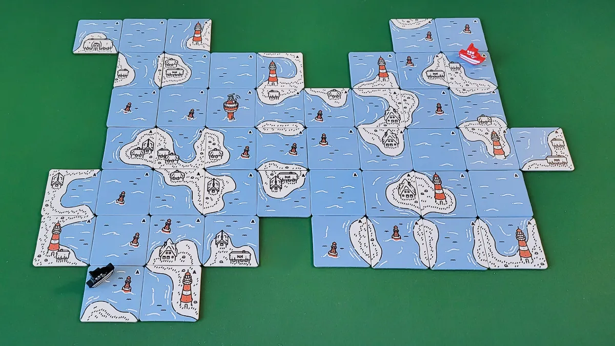 The game ends when all tiles have been used or discarded. You score points only for fully explored tiles, which are tiles surrounded on all four sides. Lighthouses are worth three points, beacon buoys are worth two, and all other explored tiles are worth one point.