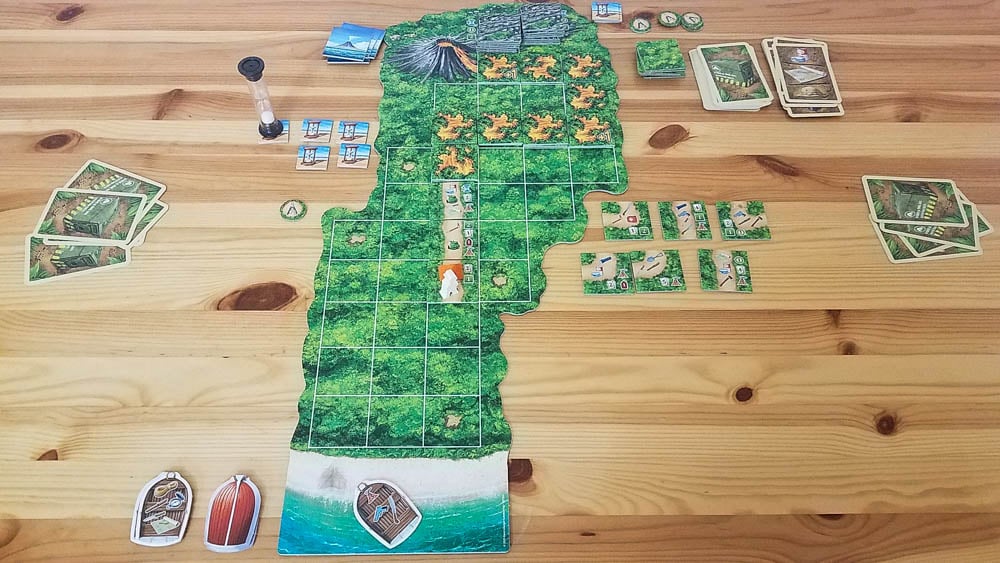 There are also optional bonus tiles included with the game that you can place on certain spots on the board, making the game slightly easier. To make the game a bit more difficult, you can play on the reverse side of the board and use the quest cards, which force you to hit specific spots in the jungle on your way to the boat.