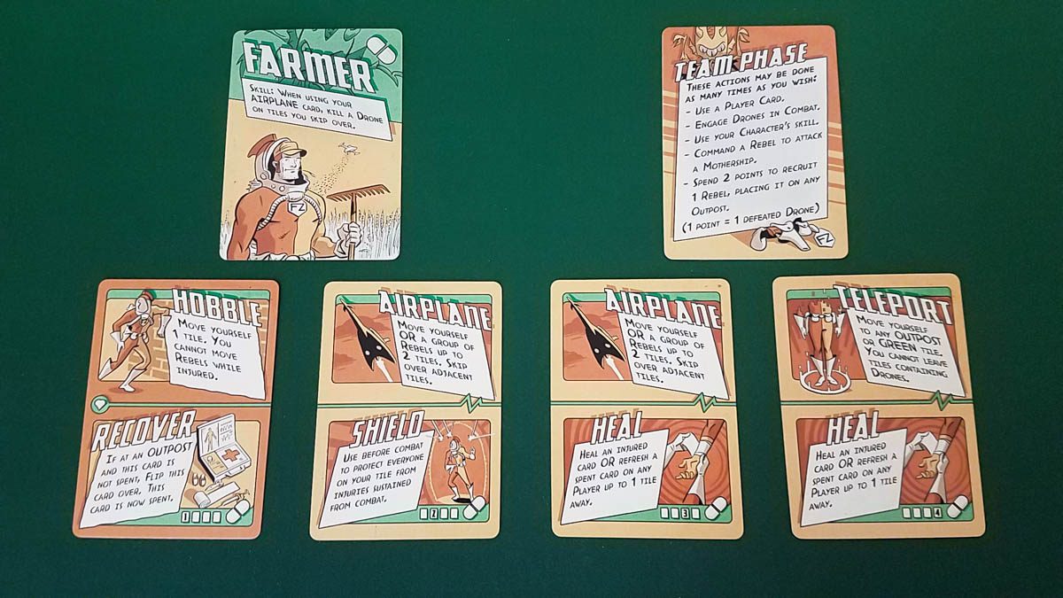 Each character has a skill and four dual-use action cards that are unique to them based on their focus (medical, political, tactical, or technological). Each action card can be used once for either its top or its bottom action each round. Some of the actions include moving (your character or any group of rebels), adding rebels, enhancing an attack, and healing.