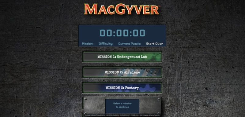 To begin a MacGyver: The Escape Room Game mission, you’ll grab the envelope for that mission and also go to that mission’s page on the game’s website. You can play the missions on Easy (not timed), Medium (75 minutes), or Hard (45 minutes) difficulty.
