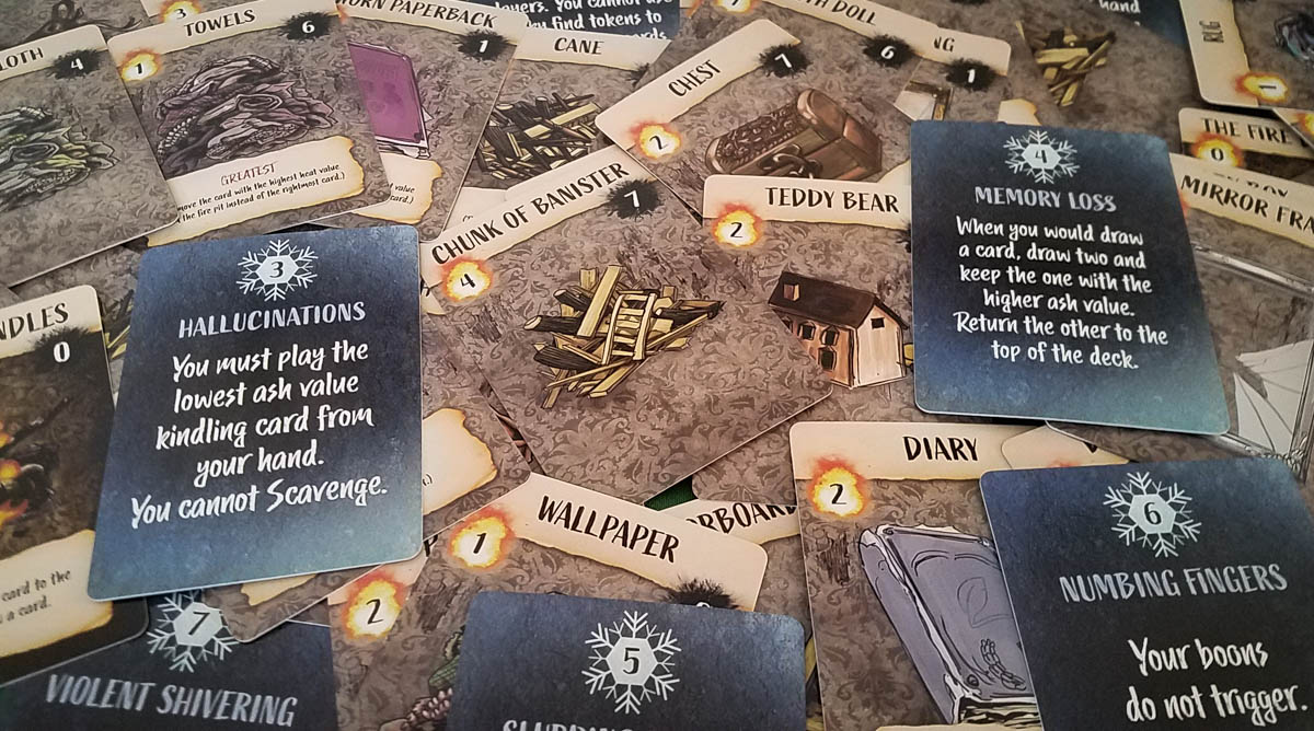 After you’ve played a card or scavenged, the oldest Kindling card (the rightmost card in the fire pit) gets discarded and you check for frostbite. If there are less than three cards in the fire pit, you’ll draw a Frostbite card that will give you some type of restriction until it’s removed/healed; it’s removed if the total heat value of the cards in the pit is exactly equal to the number on the Frostbite card at the beginning of a future turn. You then draw one new Kindling card and the next player takes their turn.