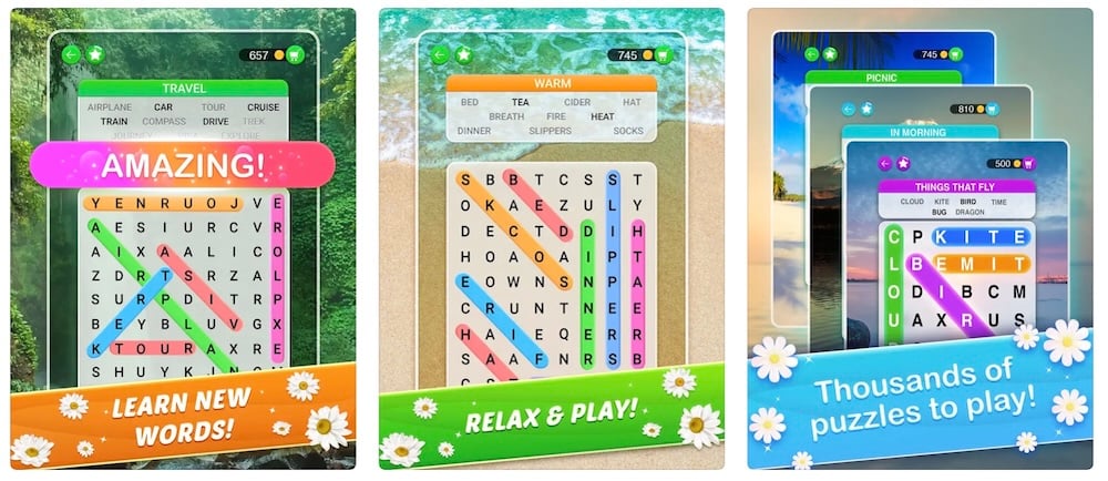 Players get to swipe through letter grids to uncover hidden words in the Word Search Explorer app. Themes change and difficulty levels increase as you progress through the game.