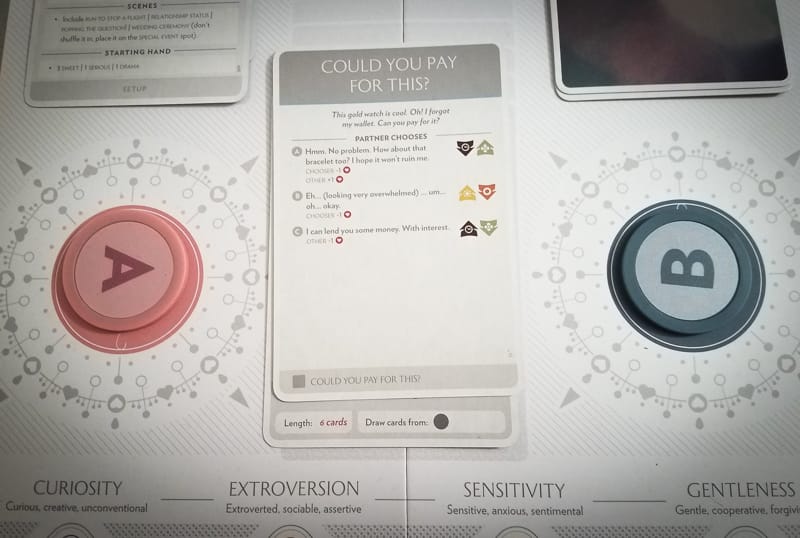 On each turn, you’ll have five Scene cards in your hand and you’ll play exactly one of them. The scenes will usually have multiple choices for you to choose from. Some only require one player to make the choice, and others have both players secretly make their choices. The choices made can affect the personality tracks and the characters’ satisfaction, or they can even affect the cards in your hands.