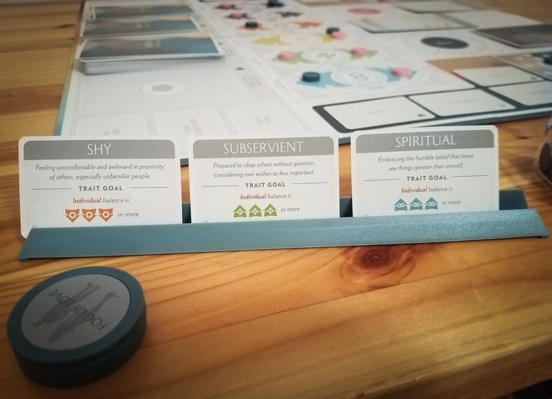 At the beginning of the game, you’ll secretly choose three Trait cards for the characters, which will have end-game goals written on them. After that, you’ll choose occupations for the characters. Finally, you’ll choose three Feature cards for the other player to show what made you interested in them. The Occupation and Feature cards give you your first personality tokens. You’ll also have a set of Destiny cards, which are similar to the Trait cards but have multiple goals on them. After the characters are created, you’ll want to name them and get a feel for who they are based on all of the cards and tokens that are on the board.