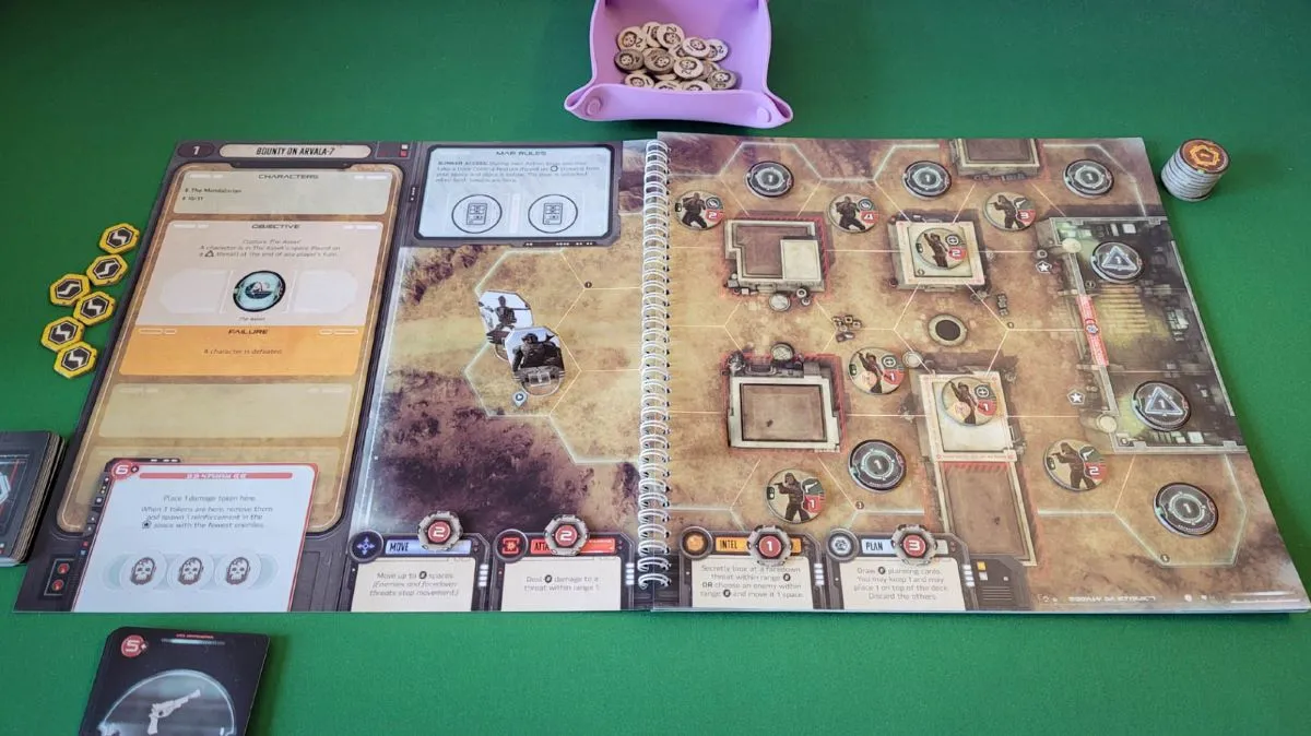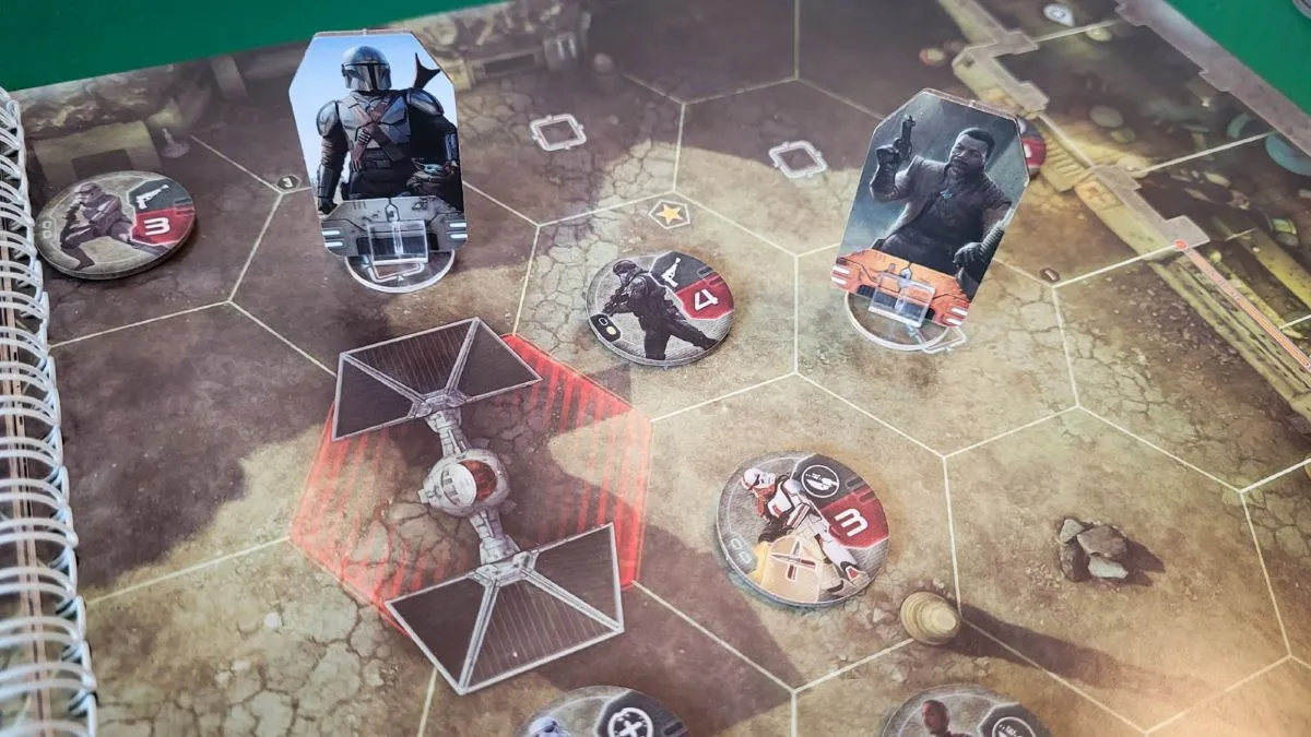 - I am starting to prefer these “maps in a book” style of games over large tile layouts, but the downside of that can be that you run out of room on spaces for multiple characters and items. That definitely happens in The Mandalorian: Adventures, forcing you to stack enemy tokens to save space. Not a huge deal, but a little annoying.