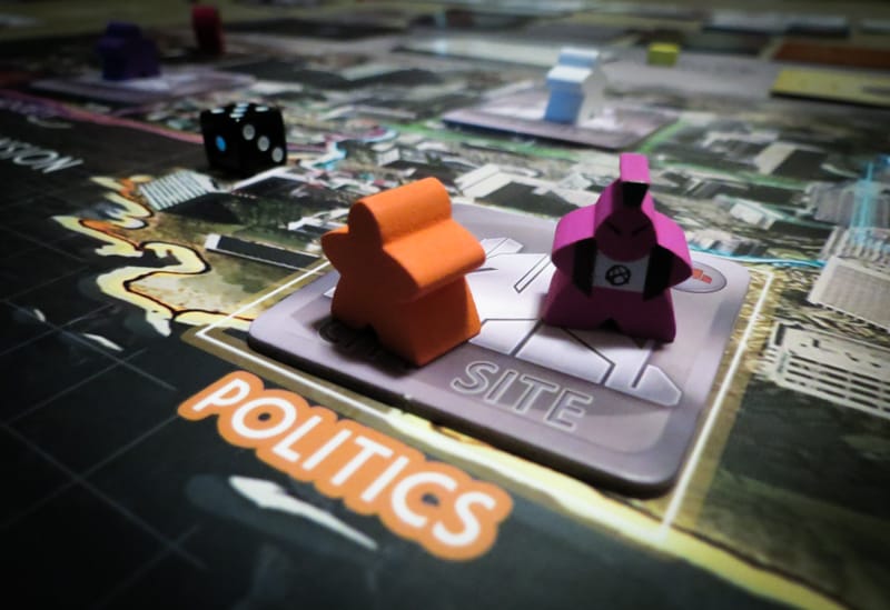 Facing punks is super-simple process but also very important. You’ll roll a die for the punks to see if you get any corruption (1 or 2 on the die is a success for the punks), and then you’ll have the option to roll a die to see if you force them out of the city (5 or 6 is a success for you). You’ll need to pay one resource to remove a punk on a successful roll.