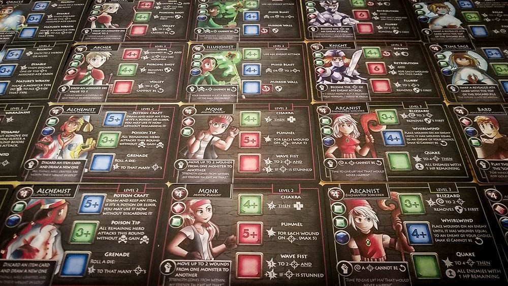 • Town Phase – During this phase you’ll have a chance to rest (heal), refresh your Hero Tokens, buy items, and level up. To buy items, you simply spend your Spoils (monsters you defeated) and put the purchased cards next to your heroes. You have some interesting decisions to make when leveling up; you can change classes (two new options) and gain a new ability from your old class, or you can keep your old class and gain an ability from a new class.