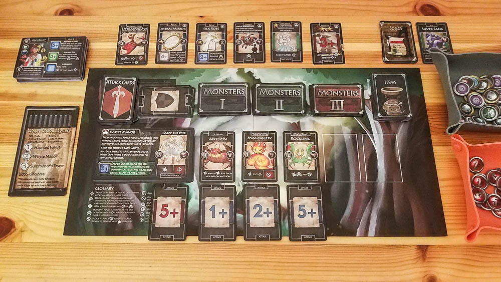 To win the game you need to make it through the three quests and defeat the final boss. You’ll lose if all of the heroes are knocked out at any point during the game or if there are no cards left in the attack deck at the end of any combat round.