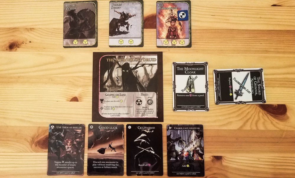 To fight, you’ll gather up all of the Light, Shadow, and Insanity dice in your pool and roll them together. You’ll then check to see how many of your heroes died, how much insanity was cast on your remaining heroes, how much Shadow and Light was gained, and whether or not you defeated the encounter.