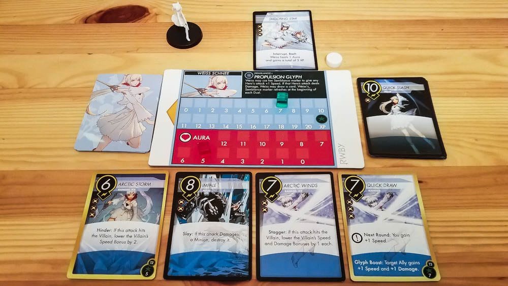 The three stats that matter for all characters in RWBY: Combat Ready are Speed, Damage, and Aura (health). During every round of a duel, you’ll be comparing the speed of your attacks (plus modifiers) to the speed of whoever you’re fighting and the highest speed wins that round. Whoever wins the duel deals their damage to whoever they’re fighting. Whenever a hero or enemy’s Aura is brought down to zero, they are out of the game.