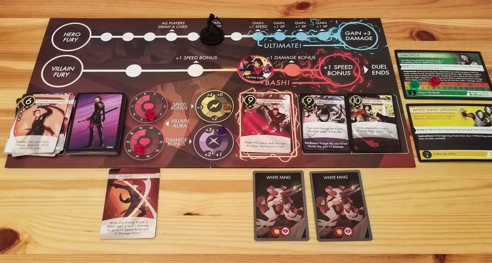 At the end of each round of a duel, the villain moves forward one space on the Fury track and the active hero will move forward one space for each point of damage they dealt. The active hero is trying to get into the Ultimate zone so they can use their Ultimate ability to win the duel. The villain is trying to get into their Bash zone as any attack that deals damage thereafter will win them the duel. The villain can also win the duel if they make it past the end of their track, but in that situation the active hero’s Ultimate ability activates (if they’re in the zone) and they win the duel.