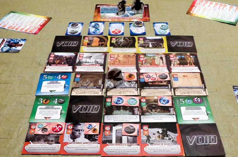 To set up a game of Saving Time, you’ll first lay out the 25 Time Tiles. There are five tiles from each age, which make up the Ancient, Medieval, Early Modern, Modern, and Contemporary eras. You’ll then flip two Crisis cards to determine where the initial crises show up (more on how that works later).