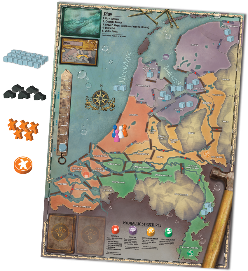 As the next game in the Survival Series, Pandemic: Rising Tide continues the hallmarks of the series. Each game enjoys a strong resemblance to the original Pandemic while uniquely adapting them to a new locale. On the lakes and polders of the Netherlands, the threat is not from diseases but from the water itself. With land becoming more and more scarce and water levels rising by the day, a modern system is needed to stem the rising tide.