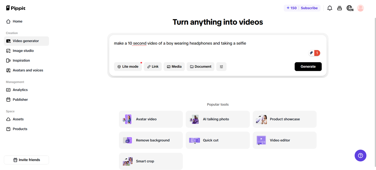 First, access Pippit and sign up. Go to the “Video generator” tab and enter your text prompt. If you want precision, upload reference media using the “Add media” tab. You can add files from your device, phone, Dropbox, or even link them directly. Assets are also available if you don’t have any media. When ready, hit “Generate”.