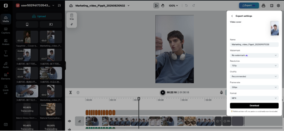 Now adjust captions manually. You can change text, size, colors, or alignment. Add filters, effects, and background music too. Once your captions look right, click “Export”. You can publish directly via “Publish” or save to your device with the “Download” tab, setting format, resolution, frame rate, and quality.