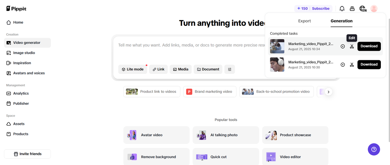 The AI automatically generates a video based on your text prompt and reference media. It cuts pacing, transitions and edits. It also automatically includes avatars, voice, lyrics, captions, and photos/videos. To make additional edits, simply click edit to enter the editing interface.