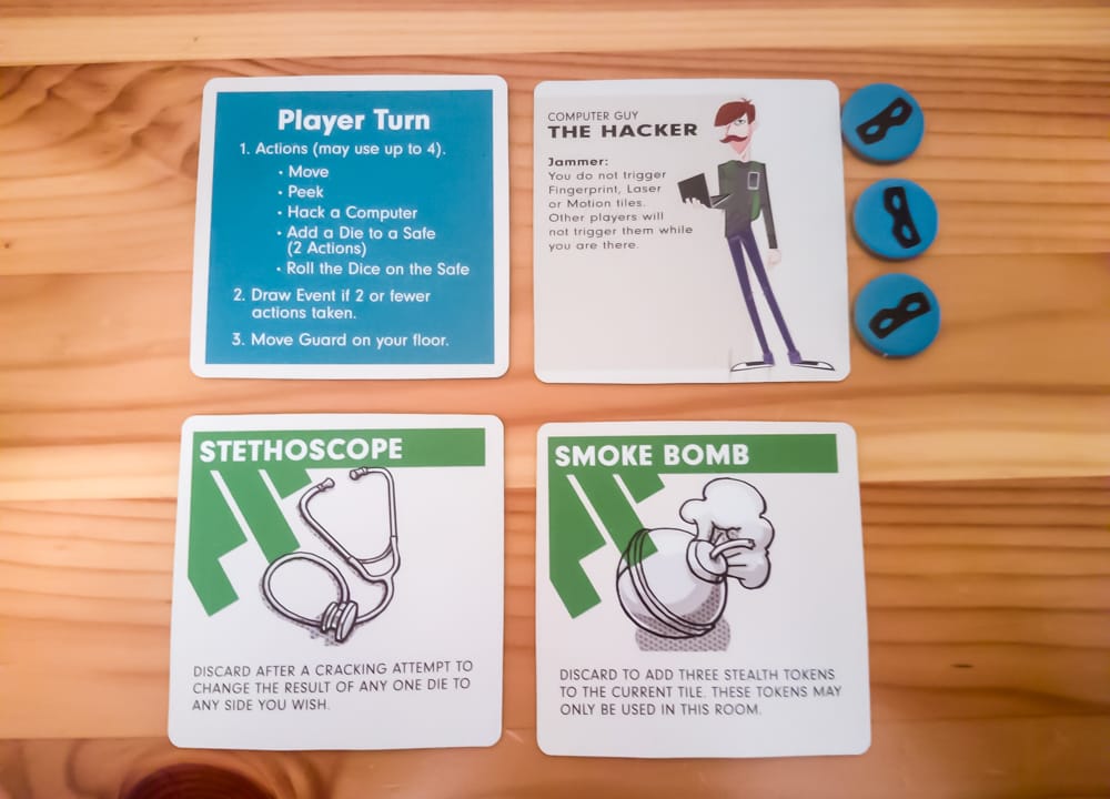 If a player is caught on the same tile as a guard, they have to spend a stealth point. If anyone ever runs out of stealth and they run into the guard, they are automatically caught and the game is over. You win if you’re able to crack all of the safes and make it up to the roof.