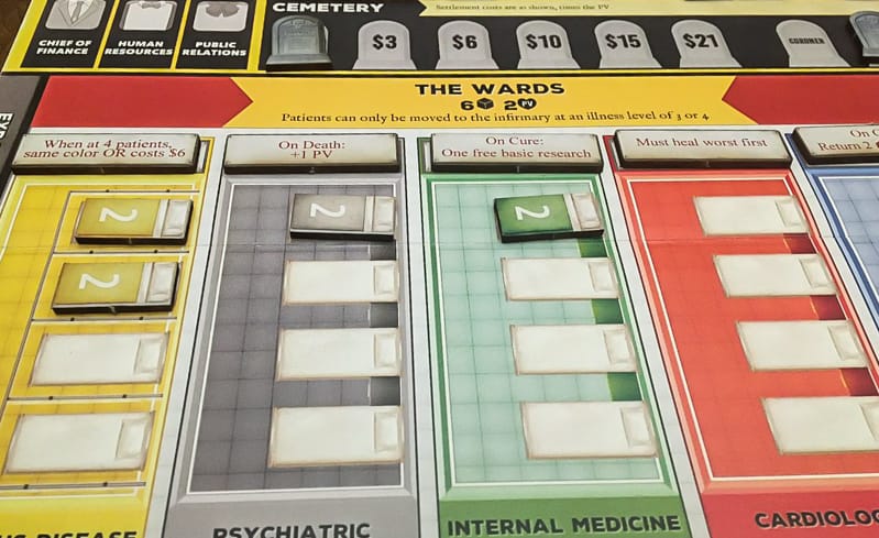 There are five different colored areas representing the patients’ needs: Infectious Disease, Psychiatric, Internal Medicine, Cardiology, and Trauma. By default, patients only have five illness levels, so they will die if five of one colored cube has to be placed in the Waiting Room or if they ever reach level five in The Wards.