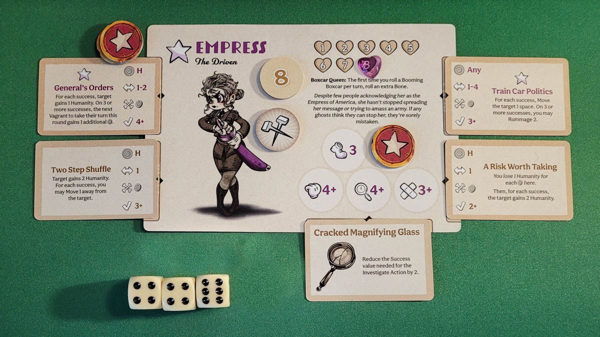 You’ll beat a scenario by satisfying the victory condition(s), which is usually when the Haint gains back all of its lost humanity. You’ll lose if all of the Vagrants are Westbound, which occurs when a Vagrant has had all of its Skill and Junk cards flipped over due to losing Humanity (health) during a scenario. Regardless of whether you win or lose, you always move forward in the campaign.