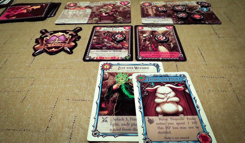 The taunt ability is probably the most important ability in the game. It allows you to pull one monster from another monster group and put it in front of your character. The defending player can taunt one monster per round by using the round/taunt token, but you can also gain this ability with some hero and item cards.