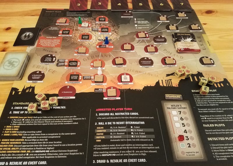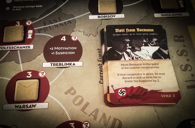 Each turn, a player will take three actions and then draw an event card. Actions include moving, conspiring, drawing Conspirator cards, playing cards, searching locations, picking up items, using special abilities, sharing cards and items, delivering items, releasing fellow conspirators from jail, and assassination attempts. If a conspirator starts his or her turn in the same space as Hitler and/or his deputies, that conspirator will have to take the penalties written on those enemies’ tokens.