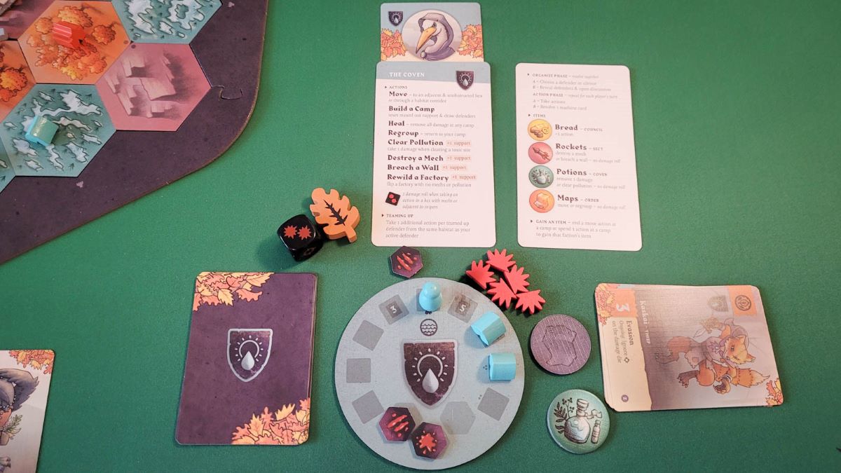 Each faction comes from a different habitat—plains, forests, marshes, or mountains—and has its own unique strengths and abilities. To win, you need to work together to rewild all the factories and ensure that every player puts all of their camps on the board. Along the way, you’ll need to make strategic decisions about where to clear pollution, fight mechs, and breach walls to open up pathways for movement.